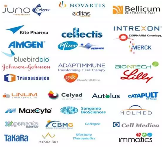 癌癥免疫療法是通過內源和外源方式克服免疫抑制。美國前總統卡特在2015年12宣布其接受4個月的PD1免疫檢查點抑制劑治療后,腦部的黑素瘤已經完全消失;且自美國5歲女孩Emily接受CAR-T療法后病情得到完全緩解之后,癌癥免疫療法已經被列為當年排位第一的科技進步,自此世界各大藥物和疾病研發巨頭也加強了在該領域的研究。下圖1中列出了國外參與免疫細胞治療(CAR-T、TCR-T)的部分公司