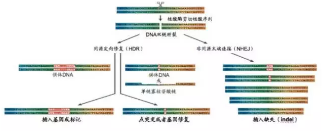 基因編輯技術指特異性剪切基因組DNA位點的技術。基因編輯特指在基因組上進行特定位點的剪切。基因編輯是指在基因組上剪切將基因編輯與傳統的暫時性表達的質粒區分開來,對特定位點剪切將基因編輯與隨機整合進入基因組的逆轉錄病毒區分開來。下圖2描述了基因編輯的步驟和預期達到的效果