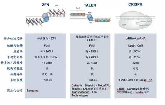 基因編輯的優勢在于特異性直接編輯基因組,具有可持續性和安全性。當前的基因編輯技術主要分為三種:ZFN、TALEN和CRISPR,它們的技術各具優勢,這三種技術的比較圖如下圖3: