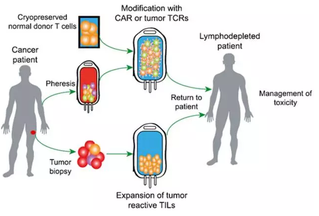 與TILs相比,開發轉基因的方法克服對腫瘤特異性T細胞免疫耐受。這種方法通過轉導嵌合抗原受體(融合抗原結合域及T細胞信號結構域)或者TCR α/β異二聚體,使T細胞能夠重新高效的識別靶細胞。通過輸注能夠識別特異靶標的基因修飾T細胞,賦予免疫系統以新的非自然免疫活性。這種方法除了能像細胞毒性化療和靶向治療快速殺滅腫瘤外,還避免了疫苗和T細胞檢查點療法的延遲效應。