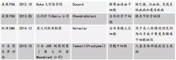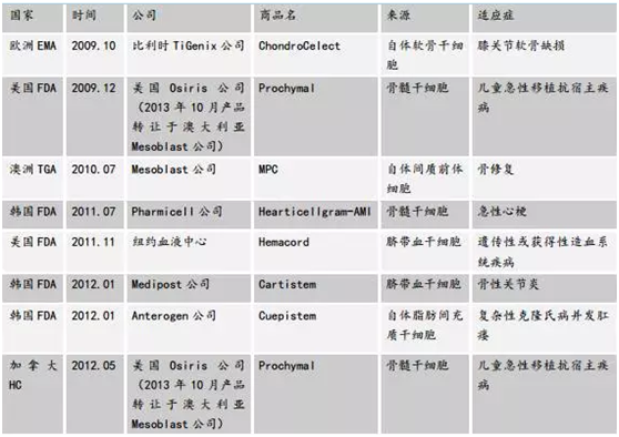隨著國際上多個發達國家和地區干細胞應用相關法規的頒布,干細胞產品的研發和在于疾病的應用研發也有了較好的成果和較大的突破。韓國在干細胞藥物領域的研發為世界矚目,下表1列出了近年來研制出的干細胞產品