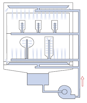 燒瓶及廣口瓶在雙層清洗架上的直接清洗,瓶內(nèi)部通過噴水支架清洗,瓶外部通過旋轉(zhuǎn)噴臂清洗;