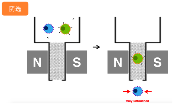 b) 陰性分選(負(fù)選):磁珠結(jié)合不需要的細(xì)胞,游離于上清液的細(xì)胞為所需細(xì)胞。