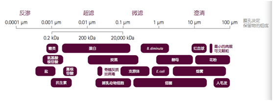 圖1:反滲透、超濾、微濾和澄清所對應(yīng)的膜孔徑大小。