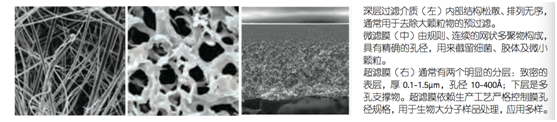 圖二:從左至右分別為深層過濾、微濾和超濾介質(zhì)的橫截面電鏡照片