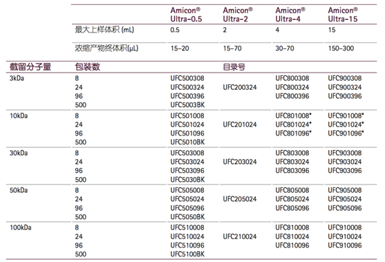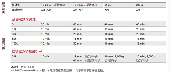 Amicon® Ultra系列超濾管產(chǎn)品需要根據(jù)起始樣品體積、目標(biāo)蛋白或核酸的分子量、終體積及濃縮倍數(shù)等選擇具體型號。下表為選擇最 適合截留分子量的超濾管提供了一些參考建議。如有其他疑問請給我們發(fā)郵件或電話咨詢。