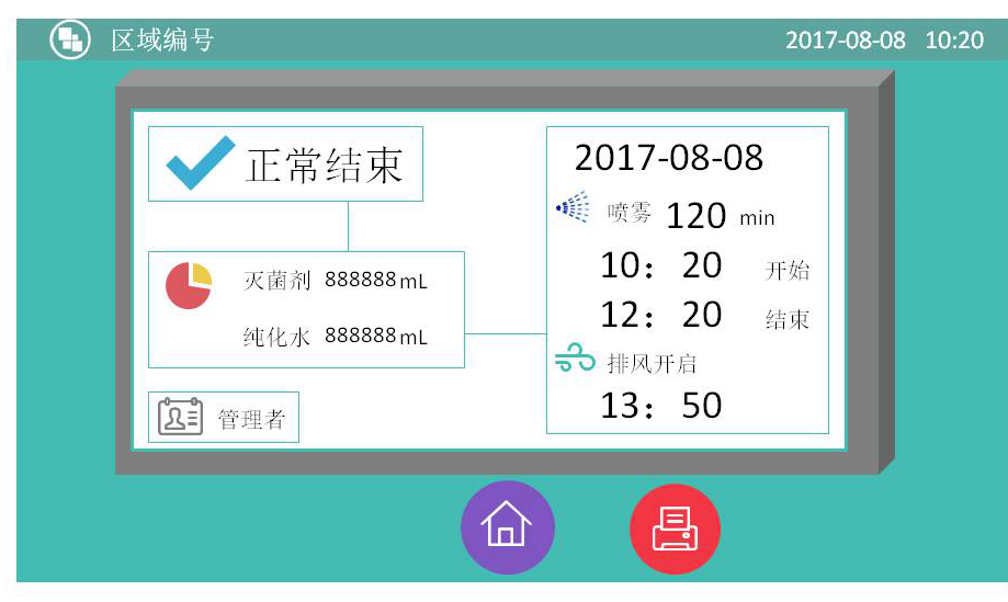 2. 自動控制的滅菌程序。配液方案在現場,通過環境的參數計算得到。操作人員可直觀的按照屏幕提示進行配液,避免人員操作失誤。根據配液方案及噴霧氣壓,從而獲得噴霧需要的時間,實現設備自動計時,無需人員留守。也可以遙控的方式,在安全范圍外進行設備的啟停控制。