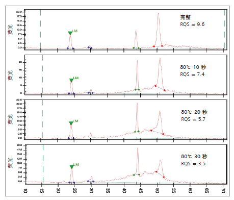 圖6:從上至下顯示 RNA 樣品的降解過程,強制性的對完整的 RNA 通過加熱一系列指定時間使之降解,以展示樣品的降解過程。