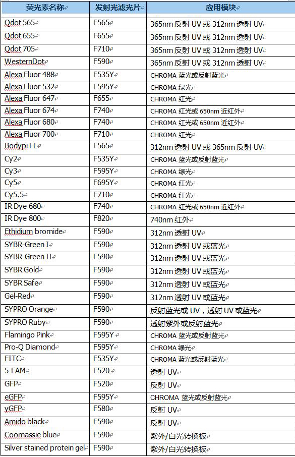 以UVItec多功能凝膠成像系統Alliance Q9 Chroma為例,其多色熒光模塊應用列表如下: