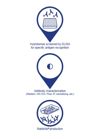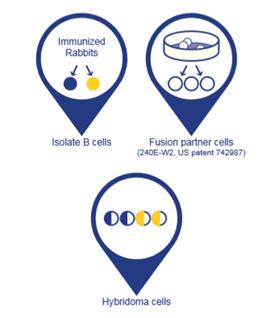 專利的兔融合伴侶細胞能與兔 B 細胞融合,形成兔雜交瘤細胞——真正的兔-兔雜交瘤細胞 。隨后篩選雜交瘤細胞以選擇具有特異和敏感的抗原識別能力的克隆體,并采用多種方法鑒定抗體(參見下圖的 RabMAb 生產(chǎn)工藝)。
