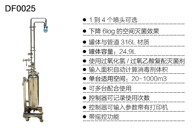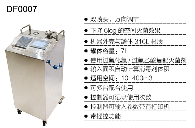 作為對一般消毒的周期性補充,廣州東弘針對高等級滅菌的需要,推出了使用干霧式過氧化氫復合配方的空間滅菌產品:DF潔凈空間滅菌系統。