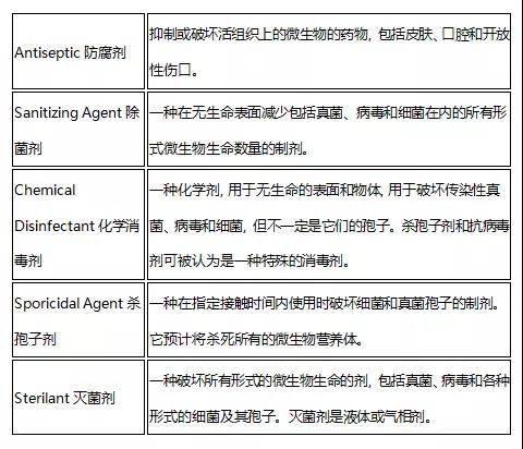 而美國(guó)的USP 1072 DISINFECTANTS AND ANTISEPTICS 中就較為復(fù)雜,分為Antiseptic抗菌劑、Sanitizing Agent除菌劑、Chemical Disinfectant化學(xué)消毒劑、Sporicidal Agent殺孢子劑、Sterilant滅菌劑等數(shù)種。