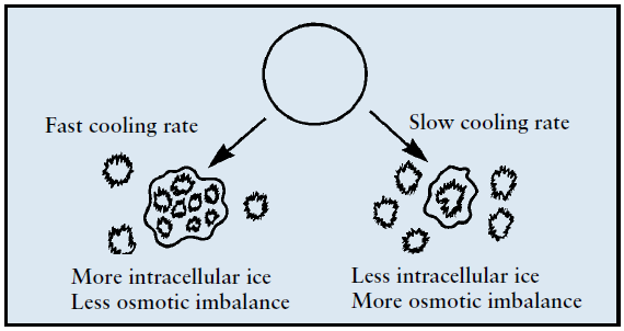 樣品凍存過程中,降溫速率過快/過慢都會對細胞造成損傷以致影響復蘇活性。降溫過快時,細胞內的水迅速結晶,冰晶會對細胞造成內部損傷;如果降溫速度過慢,細胞外的水先結冰,會在細胞內外產生滲透壓,會造成細胞脫水,降低細胞復蘇率。