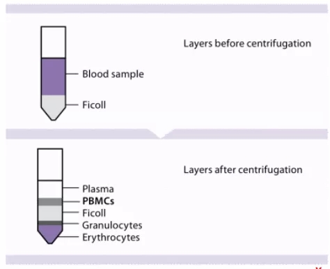 實驗室中PBMC的常規來源過程如下:外周血單個核細胞是從正常血液全血樣本中,通過Ficoll離心純化,最終獲得外周血單個核細胞(如下圖)。