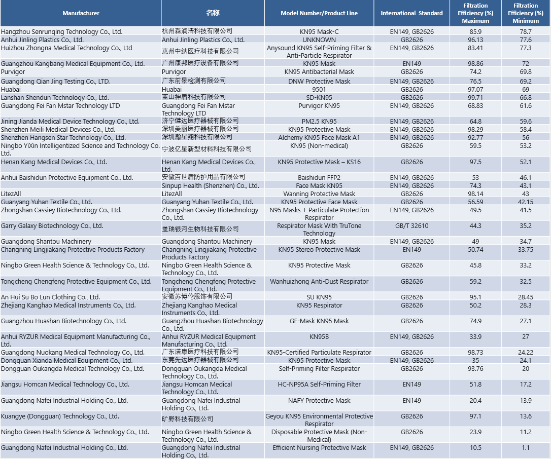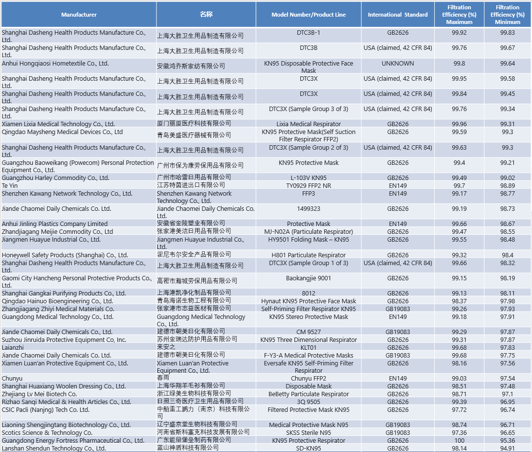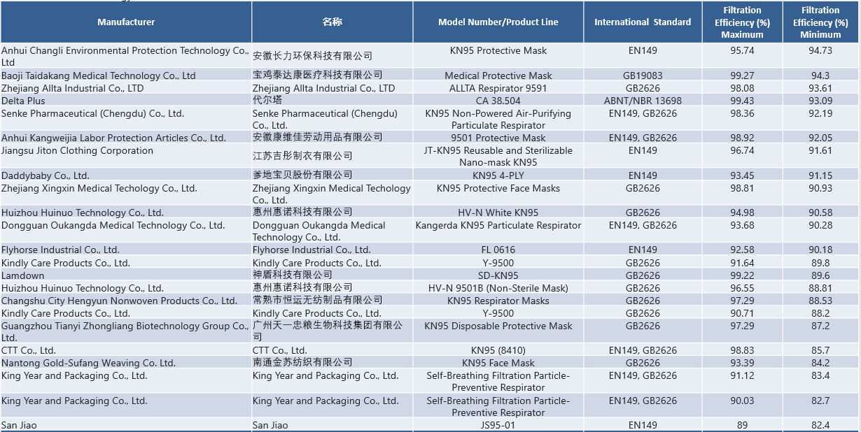 基于中國KN95口罩執行GB2626-2006標準、美國NIOSH N95檢測標準與歐洲CE FFP2 EN149:2001+A1:2009標準在過濾效率上基本一致,因此可以認為本次的檢測結果也可以反映出這些口罩在中國合格與否。