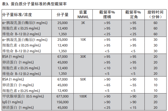 Amicon® Ultra超濾裝置濾膜的特征由標稱分子量限值(NMWL)描述,即它們截留超過一定分子量的分子的能力。分子量接近NMWL的溶質可能只有部分被截留。濾膜的截留率取決于溶質的分子大小和形狀。在大多數應用中,分子量是用來評估截留特性的一個方便的參數。Merck Millipore Ltd.建議在濃縮應用中使用濾膜NMWL至少比蛋白質分子量小兩倍的濾膜。請仔細查看以下Millipore官方數據。