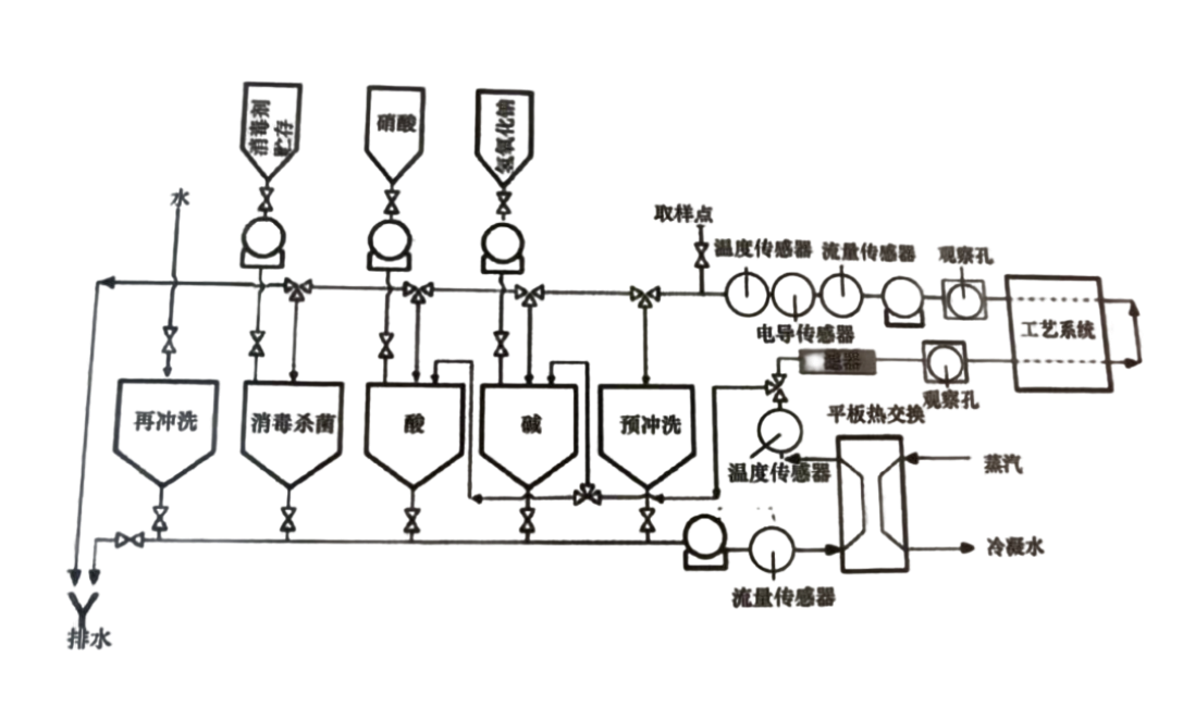 清洗:通常是堿洗或酸洗。這一步的目的是從產(chǎn)品接觸的表面上盡可能去除產(chǎn)品污垢和相關(guān)微生物。由于需要相對長時間的沖洗,為了實現(xiàn)的操作經(jīng)濟性,需要對清洗溶液進行循環(huán)使用。