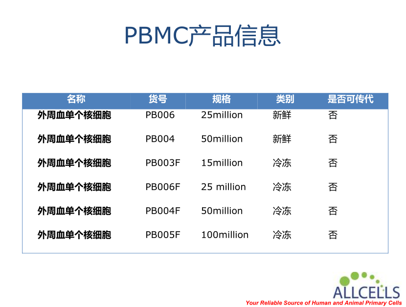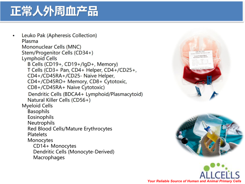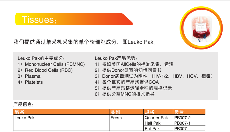 如上圖所示,健康人外周血、骨髓、臍血、動員外周血分離出的單個核細胞、CD3+ T cells、CD34+ Cells、MSC等可用于細胞治療研發的產品均在我司代理銷售范圍內,歡迎感興趣的客戶垂詢!