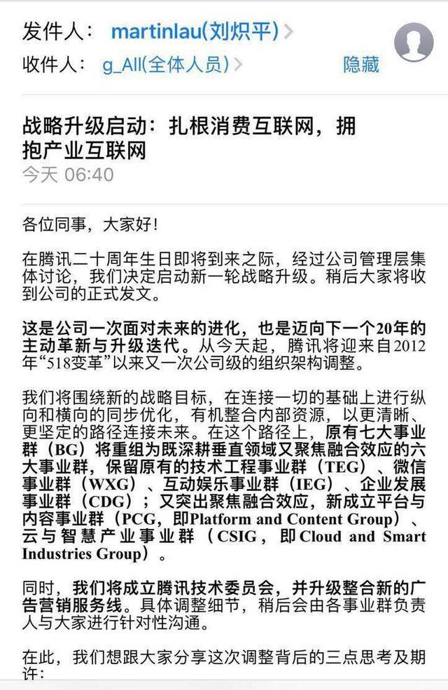 2018年9月30日早上6:40,劉熾平宣布騰訊啟動新一輪戰略升級,進行第三次架構調整,主題:扎根消費互聯網,擁抱產業互聯網。